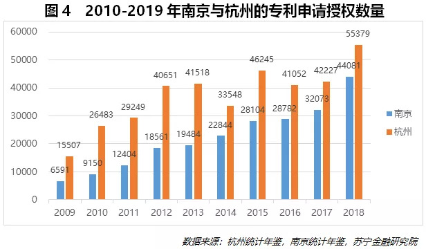 当然,教育仅仅反映地区人才的基础素质,并不绝对形成产业竞争力。事实上,南京的高校众多,却并没有转化成为绝对的科研竞争优势。以2018年的专利申请授权数量为例,杭州有55379件,南京仅有44081件(见图4)。