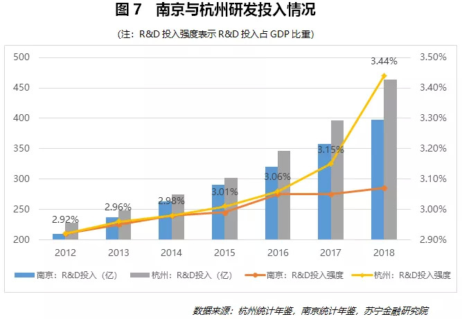 创新水平方面,前面比较了专利申请授权数量,体现的是“创新绩效”,下面再看一下南京和杭州的研发投入情况(见图7)。
