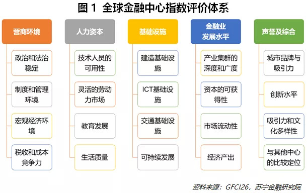 在将南京和杭州进行比较之前,我们首先要简单明确国际金融中心的评价体系,这个体系涵盖了营商环境、金融业发展水平、基础设施、人力资本、声誉及综合因素等五大指标(见图1)。