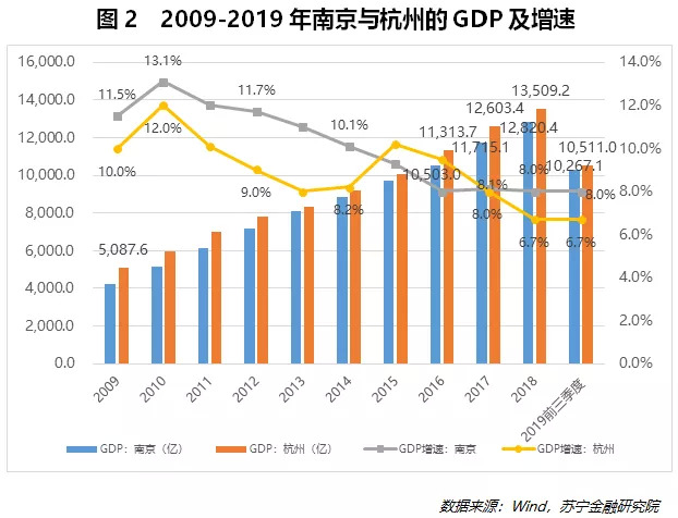 GDP总量方面,杭州略胜南京,但差距已经越来越小。截至2019年前三季度,杭州GDP领先南京不足300亿,但是GDP增速却远低于南京,按照这种趋势,南京GDP大概率将在2019年底反超杭州,实现GDP总量与增速的双超(见图2)。