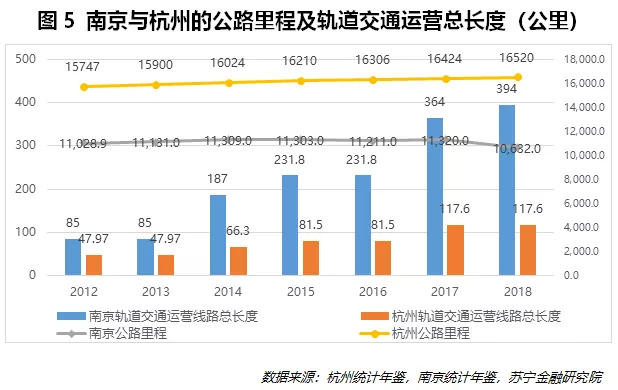 若是以典型的公路和地铁运营情况对比,杭州公路建成情况好于南京,但在城市轨道交通建设上又显著落后于南京。为此,似乎难以评价两者基础设施的优劣,但若从城市整体建设的角度去看,公共交通建设带来的社会效益要更大一些,更有利于城市的可持续发展(见图5)。是以,南京优于杭州。