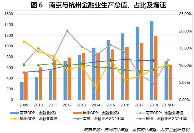 在过去近十年的时间里,南京对于杭州实现了在金融业生产总值、增速、占GDP比重等全方位的超越(见图6)。