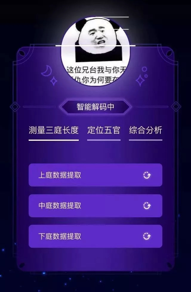 (表情包)照片提交后,点击开始测试,头像处就出现了好几个富有科技感的进度条不停拉伸又收回。同时,头像下方出现了几个面相专业术语——“上庭、中庭、下庭”,并提示“数据正在提取”最右侧还有小图标不停在旋转。。。