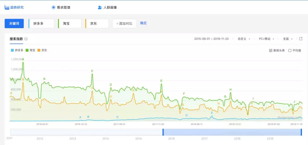 以拼多多成立的2015年9月为起点,「启蒙财经」梳理了一下,淘宝、京东、拼多多三者过往在百度的搜索指数: