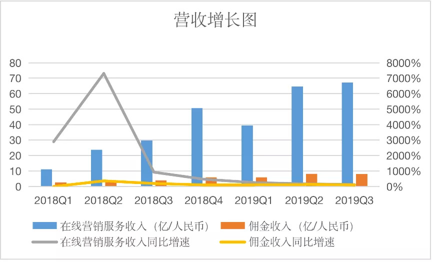 根据过往财报,拼多多的营收主要分为在线营销服务收入,佣金收入两大部分,但二者的增速是这样的: