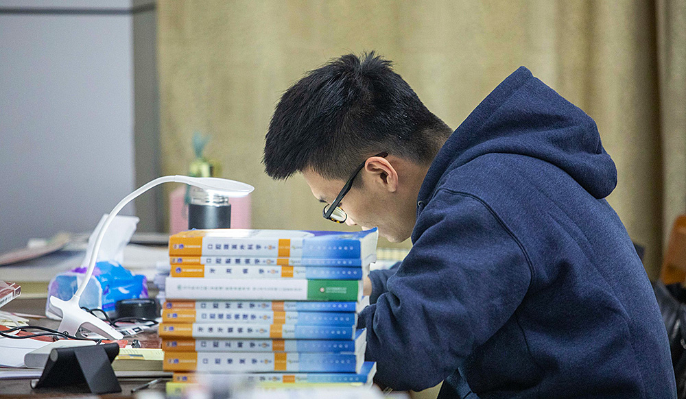 2019年11月20日,武汉,考研进入倒计时阶段,即将参加2020研究生初试的大学生们正在图书馆刻苦学习,准备考试。桌子上摆满了考研用的复习资料。