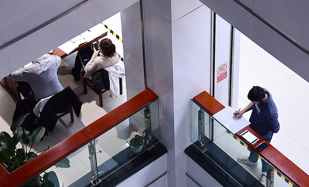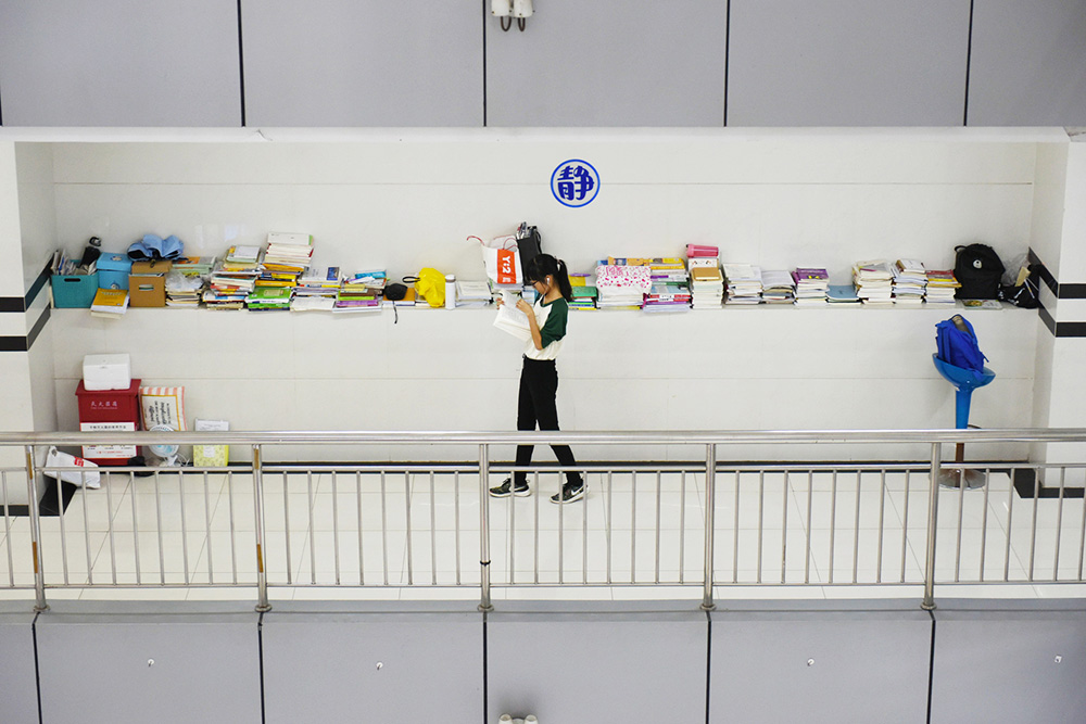 2019年11月13日,河南省郑州市,在一所高校校园内,备战2020年考研的学生们正在走廊窗边复习。
