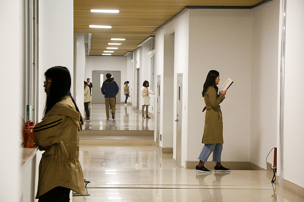 2019年10月27日,山东青岛城阳区,青岛农业大学教学楼里。考研学生为防止犯困集体坐走廊外打算朗诵和背诵知识点。