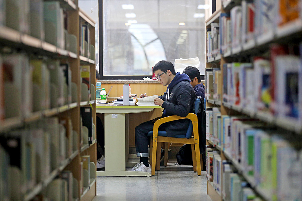 2019年11月14日,沈阳一所高校图书馆内,学生站在书架前复习。