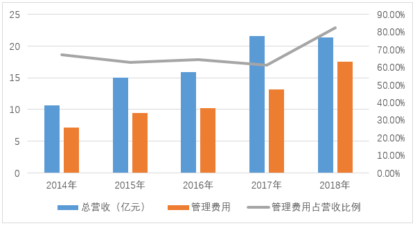 连年高毛利却依旧无法提振净资产收益率,四维图新经营是否含隐忧?财报数据显示,在年净利润增长的同时,该公司管理费用占收入比重也在不断走高。2015年以来,公司管理费用占比均超过60%,且每年也在保持较大幅度增长,2018年,管理费用占比总营收达82%。