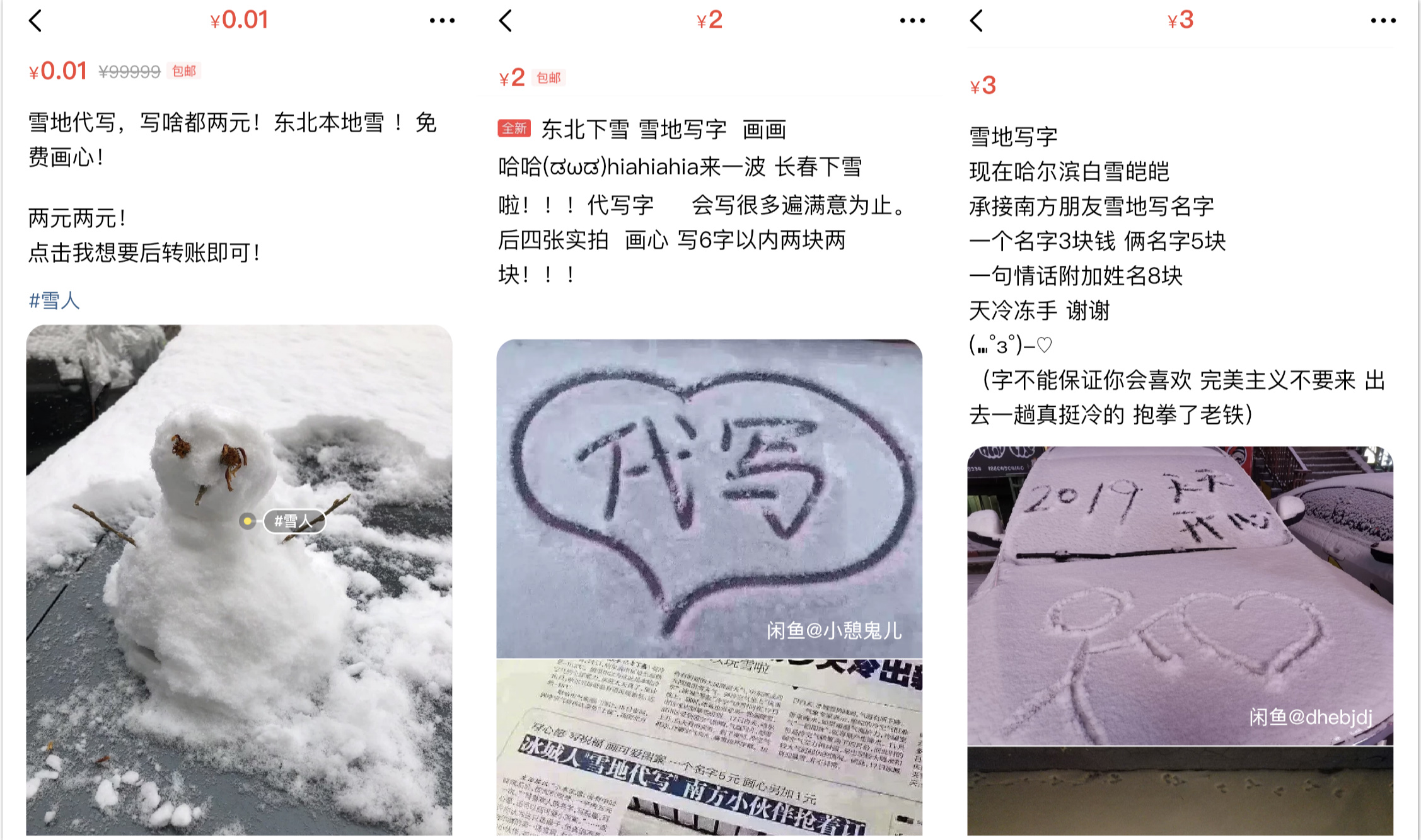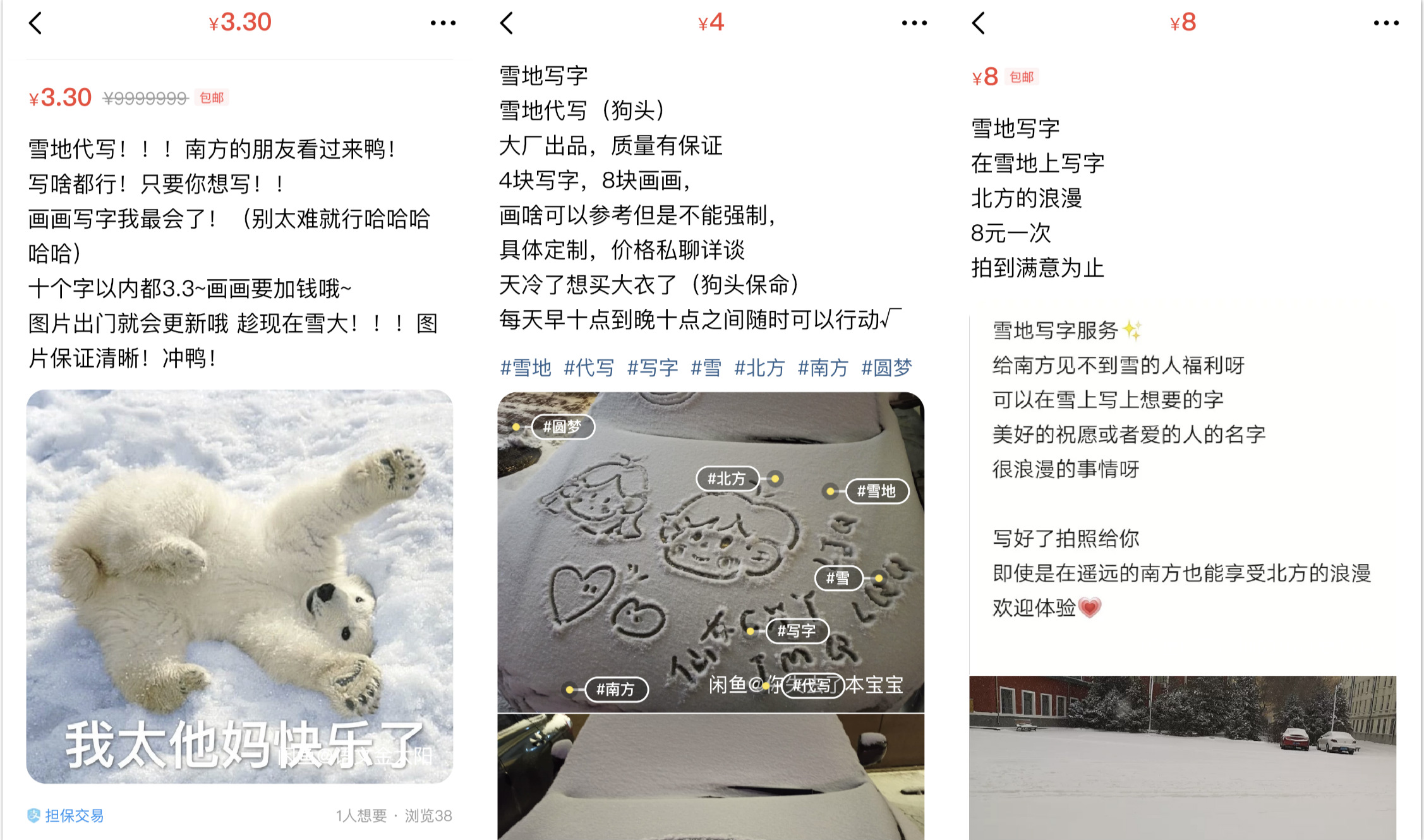 “帮南方朋友在雪地上写字,2元一个字,实际价格随缘”“不要998,只要9块8,雪地表白带回家”“见证友谊,见证爱情”“小本生意,靠天吃饭,拒绝还价,因为冻手”……打开闲鱼搜索“雪地代写”,有近百个类似的服务商品,下单和店主咨询定制内容后,不一会就能得到店主发回的一张雪地上写下指定内容的图片,根据实际字数和图案复杂程度,价格在几元不等。