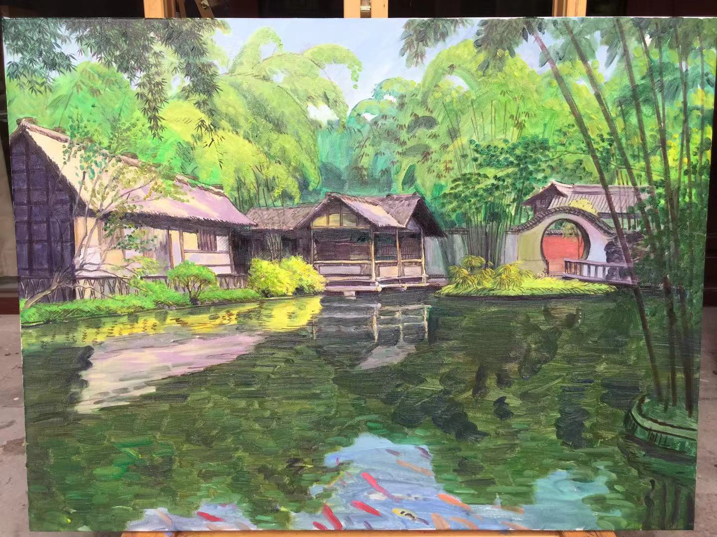 此次展览作品以草堂四季风光为主,构图独特新颖,造型简洁有力,色彩主观大胆,用笔生动自如,创造出了和以往不同的观感和意境。很多油画作品都是让观众退远后欣赏,而简先生的作品能把观众拉近画面,使观众融入其中,身临其境。这典型的川西平原风貌,是简崇民先生艺术创作的内核与标志,同时也是其近年来油画创作历程的缩影。此次展览简先生重点思考了平面油画在室内陈设的光线和色彩的视觉效果,在构图和色面的现代感上均作出了新的探索和值得发展的有益尝试。简先生一直都没有停下艺术探索的步伐,反而更加努力的思考,勤奋的作画,因此在此次展览的油画创作中才有了新的突破。