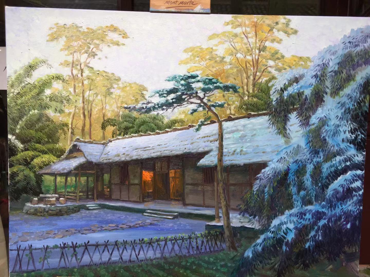 简崇民,一个时代转折中的画家,成功地找到了适合表达自己家乡、川西风情的技法和艺术语言,创造出一幅幅具有中国特色的川西平原风貌油画,成为当代中国著名的风景油画家。2018年11月,成都杜甫草堂博物馆邀请简先生创作一批以草堂四季为主题的风景油画。他用一年的时间,历经了草堂的春夏秋冬,风花雪月,用深刻的个人感受与草堂的人文历史结合自然景观相交流,创作出与众不同的40幅草堂油画作品,同时补充了近年的60幅川西风景油画写生与创作。简先生之所以愿意为草堂画四季,其得益于杜甫对自身的教育,以及对杜甫诗作的研读。在草堂创作采风前特意重读了杜诗,希望用自己最诚挚的情感,紧握有温度的笔触,细腻地表达对杜甫、对草堂的热爱。