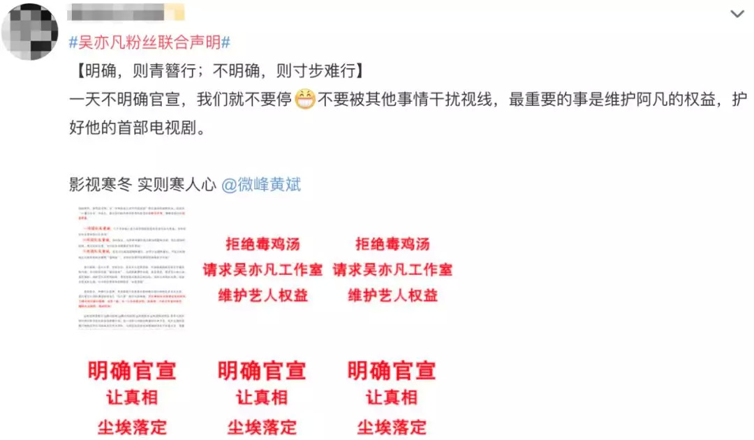 11月16日,吴亦凡粉丝发布联合声明,再次质问吴亦凡经纪团队以及负责人黄斌,为何放任合作方模糊番位。截止今日,#吴亦凡粉丝联合声明#的词条在微博已有1.6亿阅读,76.9万讨论。