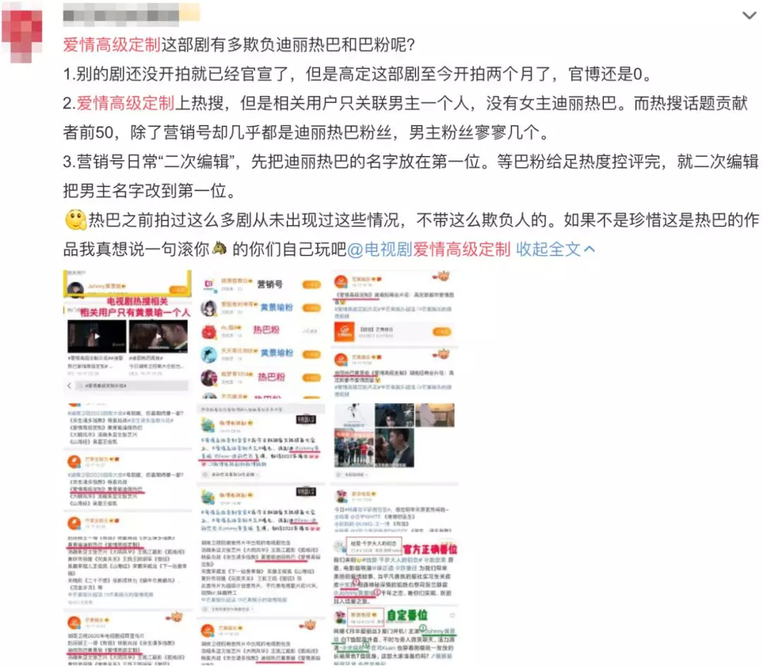 先是杨紫缺席电视剧《我的莫格利男孩》所有宣传活动,有传言是和男一号马天宇因为番位问题没谈妥所致;接下来,黄景瑜、迪丽热巴也因为《爱情高级定制》中番位问题频上热搜。