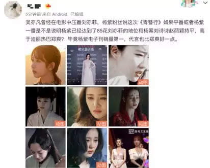 粉丝们的思路是这样的:“吴亦凡曾经在电影中压番刘亦菲,杨紫粉丝说这次《青簪行》如果平番或者杨紫一番是不是说明杨紫已经达到了85花刘亦菲的地位,和杨幂、刘诗诗、赵丽颖持平,高于迪丽热巴、郑爽?”一位微博用户依据如此标准,给当红女星排座次。