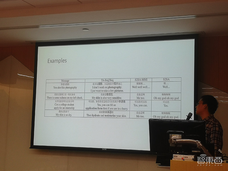 上图是三种不同模型针对同一对话给出的不同回复,当人类给出“我的皮肤好干”对话时,SSA模型给出的回复是“啊啊啊啊”,S2SA-MMI模型给出的回复是“我也是啊”,微软的TA-Seq2Seq模型给出的回复是“那就补水保湿吧”——“补水保湿“就是一个明显的信息增量内容。
