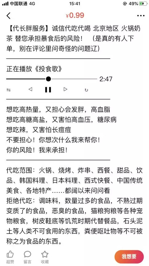 有天我突然想到了这件事,翻了翻某宝还真有人提供这种服务,就干脆上架这个代吃代喝业务,纯属好玩。没想到真的会有人来下单。