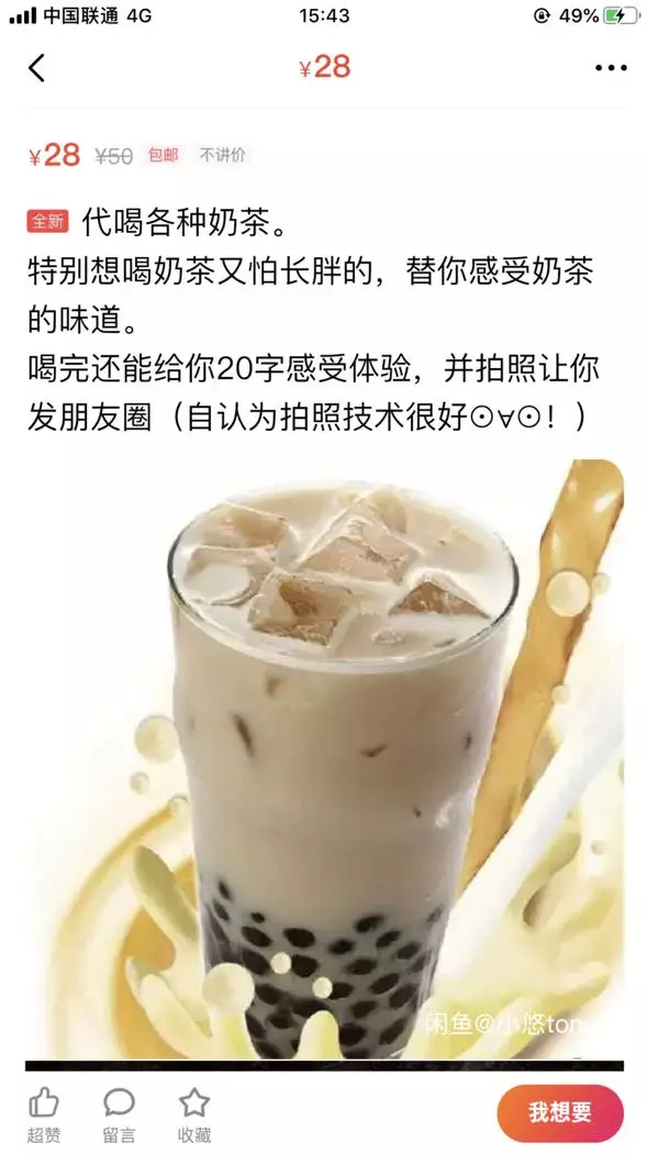 打开某宝某鱼搜索“代喝奶茶”、“代吃炸鸡”、“代吃xxx”就会跳出来一堆商家,各种搞笑表情包和奇怪的话术用得飞起。
