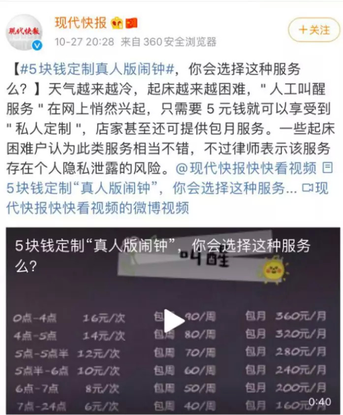 前阵,一则#5块钱定制真人版闹钟#的新闻冲上了微博热搜。