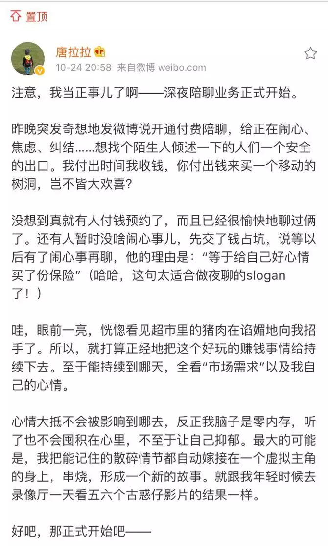 我一直关注的一个微博博主,最近也开始了电话陪聊业务,虽然半小时只能挣100块,但至少能买两斤猪肉是不?