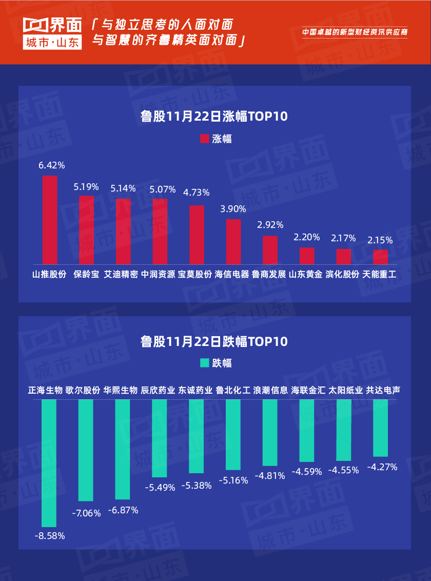 11月22日,山东省内沪深股票有55只个股上涨,141只下跌,9只与上一个交易日收盘价持平;