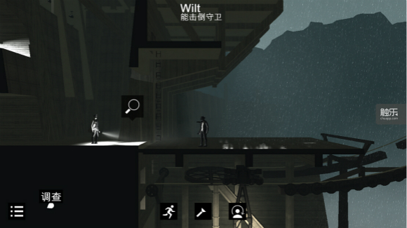 秘密潜入类游戏AI的设计是很有学问的问题。多一分太强,少一分太弱,给玩家带来的感觉却千差万别。《黑白雨夜》的AI设计有些奇怪,游戏里警卫的侦查范围让人摸不着头脑。警卫从远处朝你迎面走来,手电筒的强光把你的身体都映成白色。结果对方却熟视无睹,我赶紧掉头撤退,没想到跑步的声音太大反而引起警觉。有时候,你自以为隐藏的很妙,在石柱的阴暗面、房门的背后盘算着下一步的潜入。不料,警卫却像发疯一样的,透过墙突突突几枪就把你干掉。游戏中警卫的敏感度阈值之低经常让人措手不及,当我悄悄地接近警卫,想操控Wilt来一次漂亮的暗杀,结果警卫头顶的小红条迅速到达阈值,如果在接下来的两秒内不能接近,基本就宣告大侠需要重新来过。