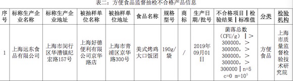 涉事样品为上海好德便利有限公司京华路店所售、标称上海远东食品有限公司生产的1批次美式烤鸡大口饭团(190g/袋 2019年09月01日)。被检出菌落总数项目不合格。