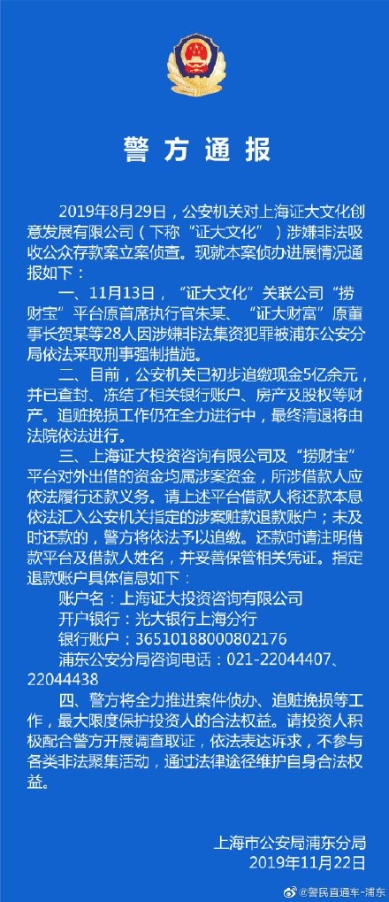 警方表示,上海证大投资咨询有限公司及“捞财宝”平台对外出借的资金均属涉案资金,所涉借款人应依法厦行还款义务。请上述平台借款人将还款本息依法汇入公安机关指定的涉案赃款退款账户,未及时还款的,警方将依法予以追缴。