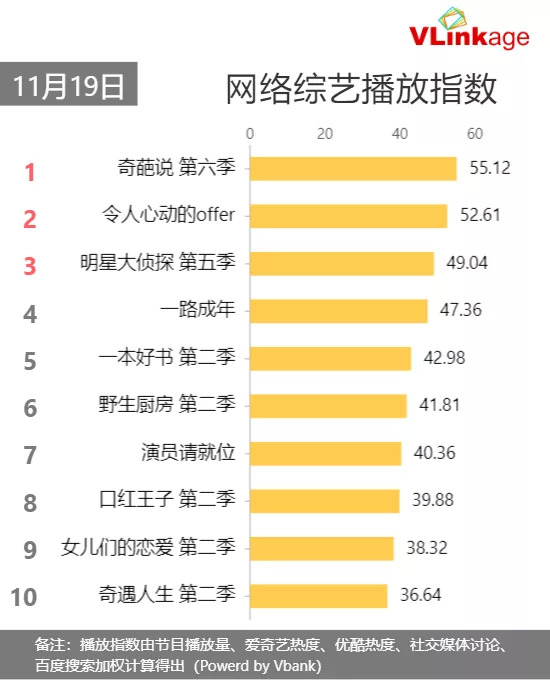 《奇葩说》已经做到第六季,豆瓣评分从上两季的7.4分和7.8分回升至8.4分,11月19日最新一期的《奇葩说》播放指数排名当日V榜首位。作为国内少有的能播出六季的网综,节目非但没有疲软下滑迹象,反倒人气、口碑回升,“生命力”惊人。