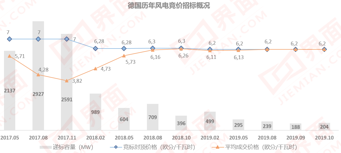 其中一个有意思的现象是,竞标的最高限定价格从2017年的7欧分下降到目前的6.2欧分,成交平均价格却从2017年底开始上升。