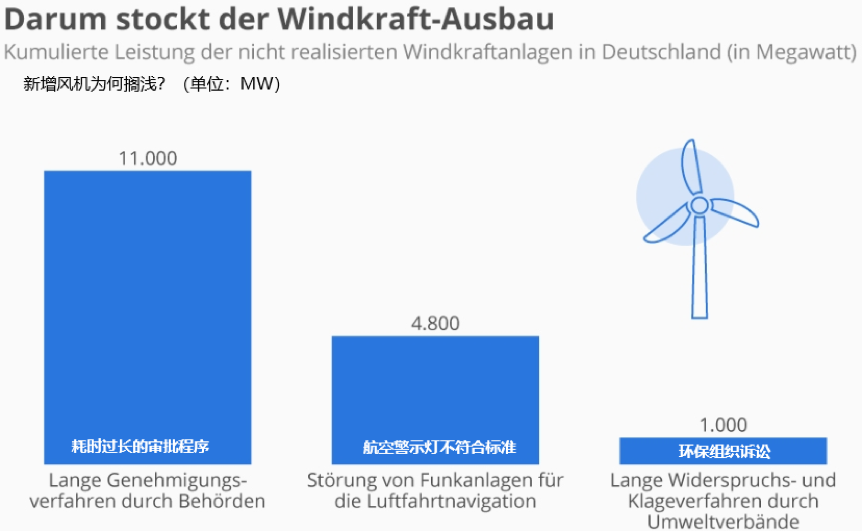 过去两年间,风电场的审批程序耗时翻了三倍,达到700-800天。德国第三大发电集团EnBW总裁马斯蒂奥斯(Frank Mastiaux)曾在一封公开信中宣称,其公司风电项目的实际审批程序耗时达到了59个月。