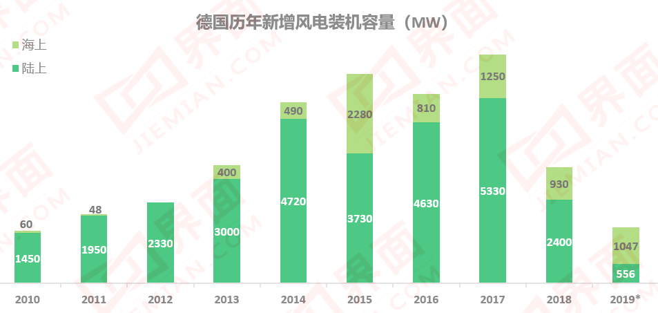 默克尔政府此前确定了一系列较为激进的能源计划,包括2030年可再生能源发电占比达65%、2050年占比超过80%,以及2022年前关闭所有核电站、2038年前彻底弃煤。业界普遍预计,唯有每年新增2.9-4.3 GW的风电容量,才能实现这些目标。