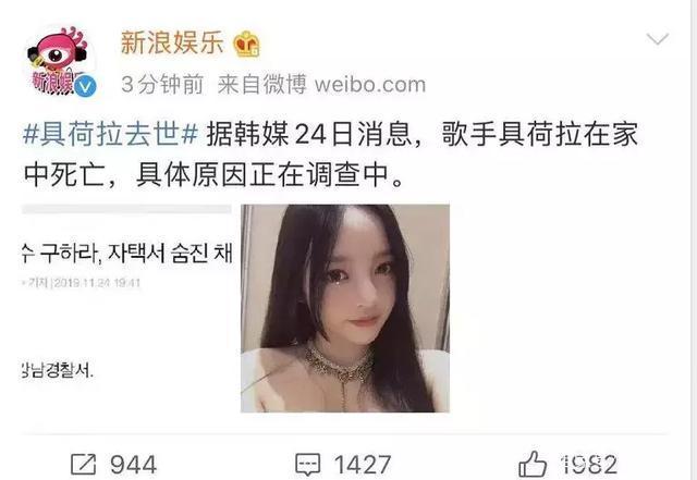 今日(11月24日)下午,韩媒传来消息,韩国女艺人具荷拉在家中死亡,具体原因正在调查中。