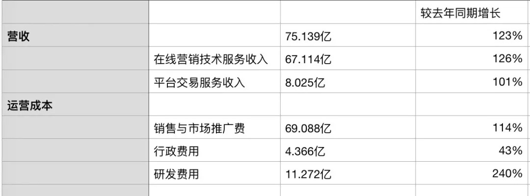 营收 75.139亿,同比增长123%(在线营销技术服务收入67.114亿,同比增长126%;平台交易服务收入8.025亿,同比增长101%)