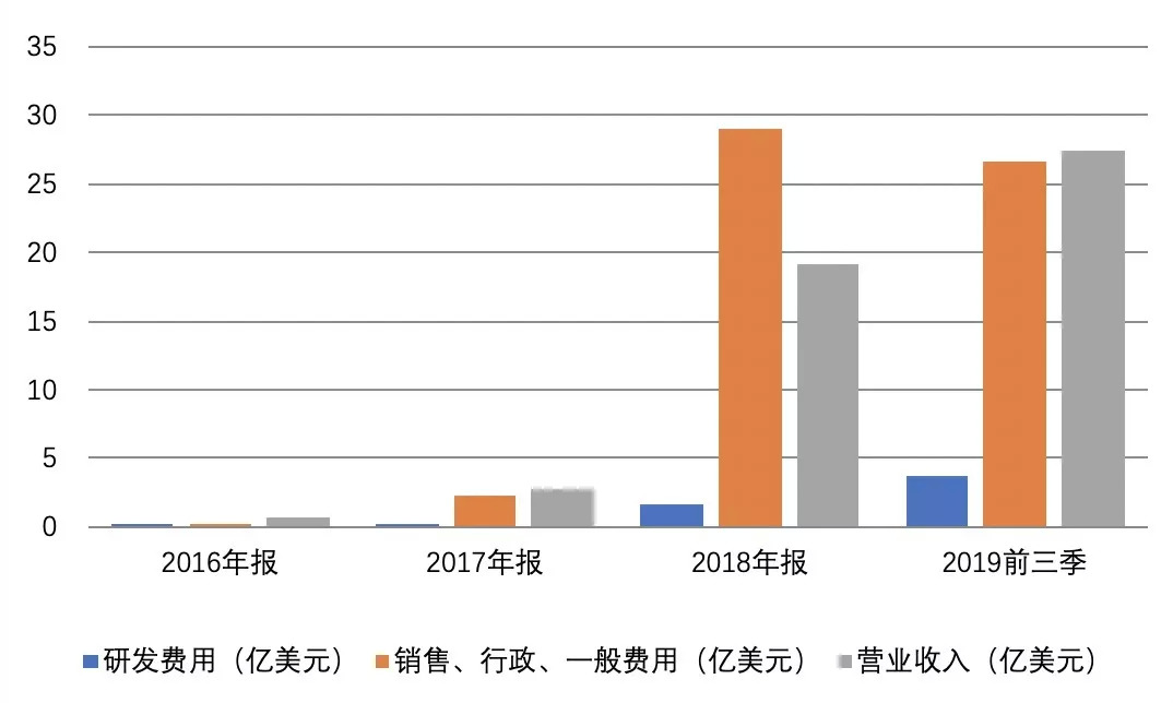 为此,2018年财年,拼多多支出近29亿美元的销售、行政和一般类费用;11月20日拼多多公布的2019年前三季财务数据中,这个数字达到26.65亿美元。当然,对应的营业收入也呈现出跳跃式增长。