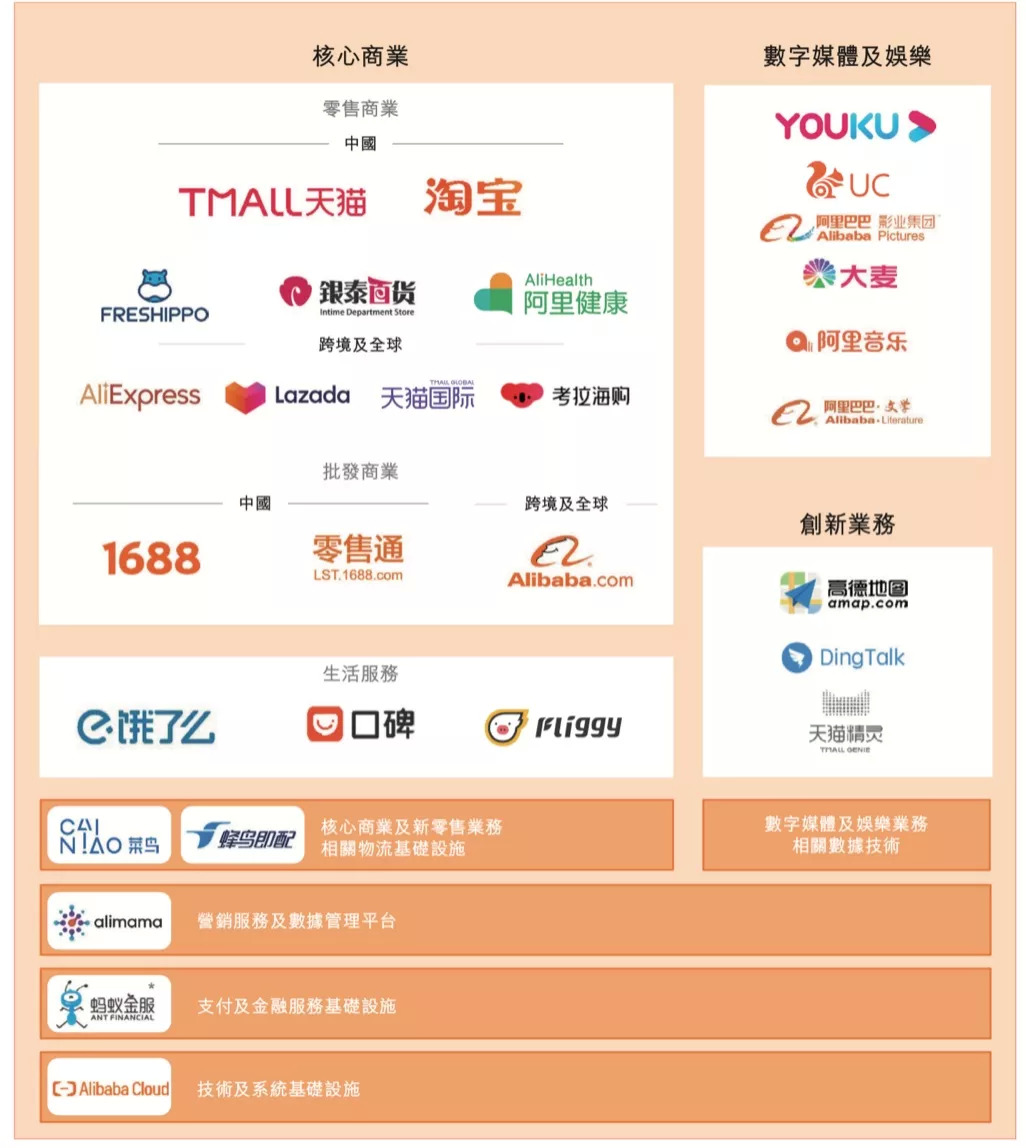截至 6月30日,阿里巴巴拥有约710家在中国设立的子公司和并表实体,约530家在其他国家和地区设立的子公司。它将这些业务分为核心商业、云计算、数字媒体及娱乐、创新业务四大类。