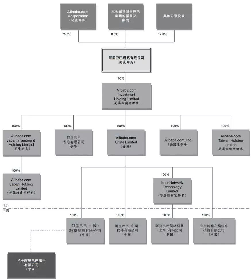 根据当时的招股书披露,上市之前,阿里巴巴网络有限公司(开曼群岛)100%持有阿里巴巴中国、阿里巴巴软件,以及阿里巴巴在美国、日本、中国香港、中国台湾等B2B业务子公司。