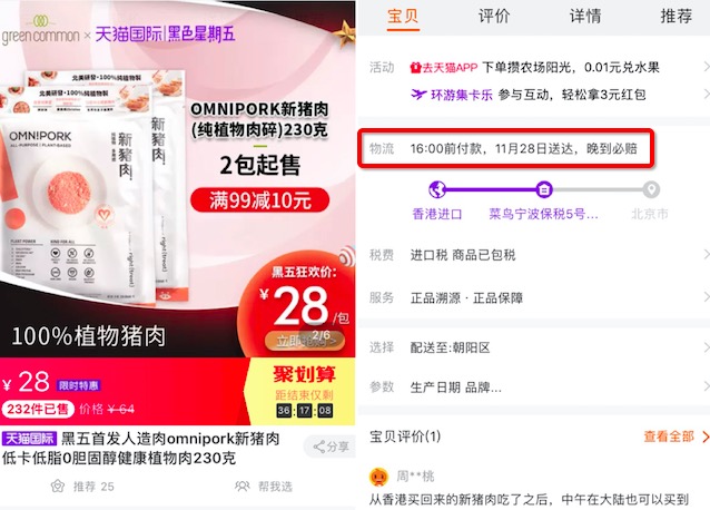 从双11之前开始“吆喝”到黑五购物节开售,香港植物肉(人造肉)品牌OmniPork新猪肉在11月25日正式登陆天猫国际,其店铺Green Common分别上新了一块装、两块装和三块装的规格,聚划算后的售价是28元一块(230克),2块起售。