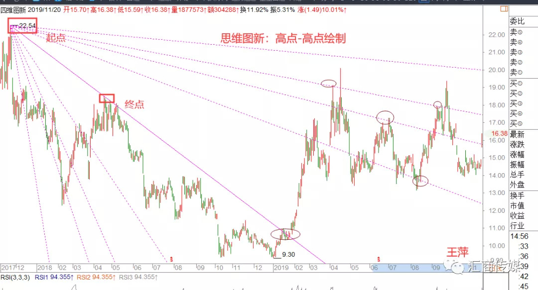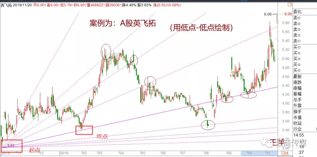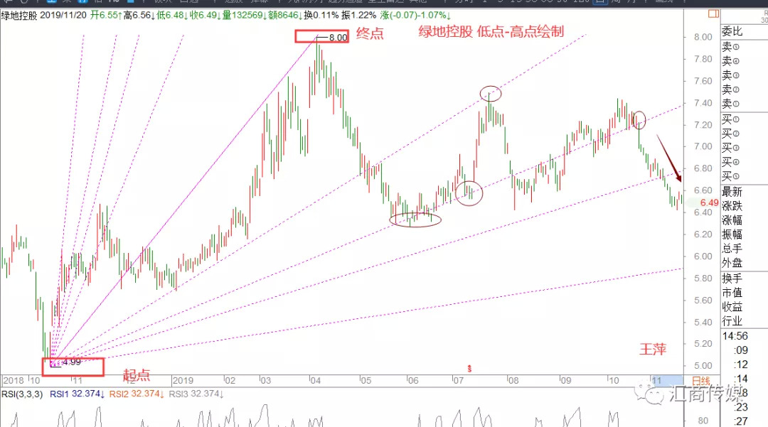 1、起点应设置在波段的重要低点或者高点,1:1过另一个重要低点或者高点。如下图所示:波段低点-低点绘制,圆圈内为作用点。