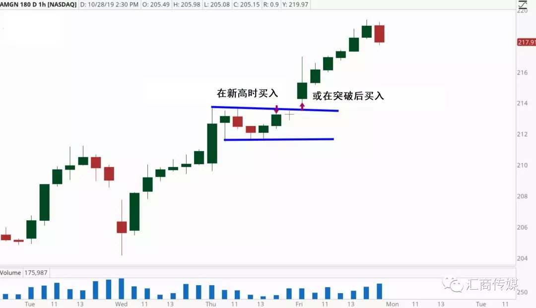 当交易牛市旗形态时,对于做多,有几个潜在的进场区域可以关注。第一个做多入市机会可以选在价格突破旗形之后。第二个可能的切入点是当价格创新高的时候。最后,交易员可以通过改变他们的图表到一个较低的时间框架,以此等待价格重新测试突破点。