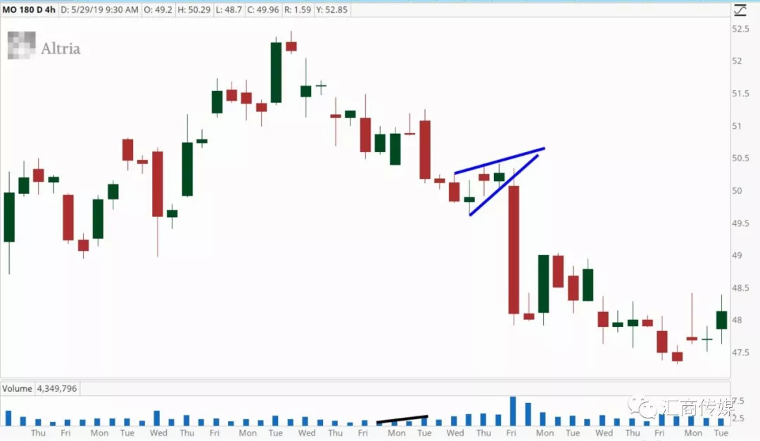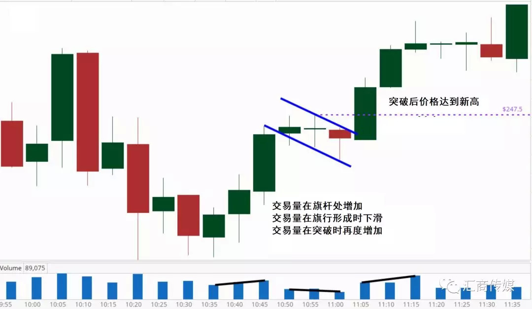 熊市旗形(也叫“看跌旗形”)是在大幅下跌后出现的一种盘整模式,其交易量特性应该与我们看到的牛市旗形相同。标的价格在初始下跌时交易量增加,然后在旗帜形成/整合时减少,最后在突破时交易量再度增加。具体的交易策略与牛市旗形大致相同。