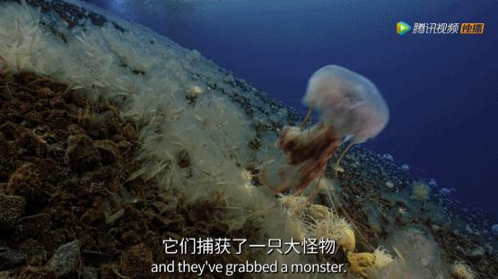 水母伸出触手捕食海葵,反而变成了对方的美食: