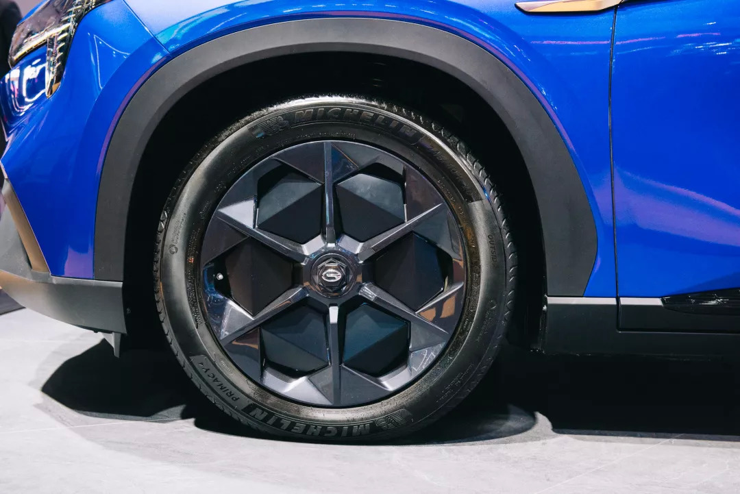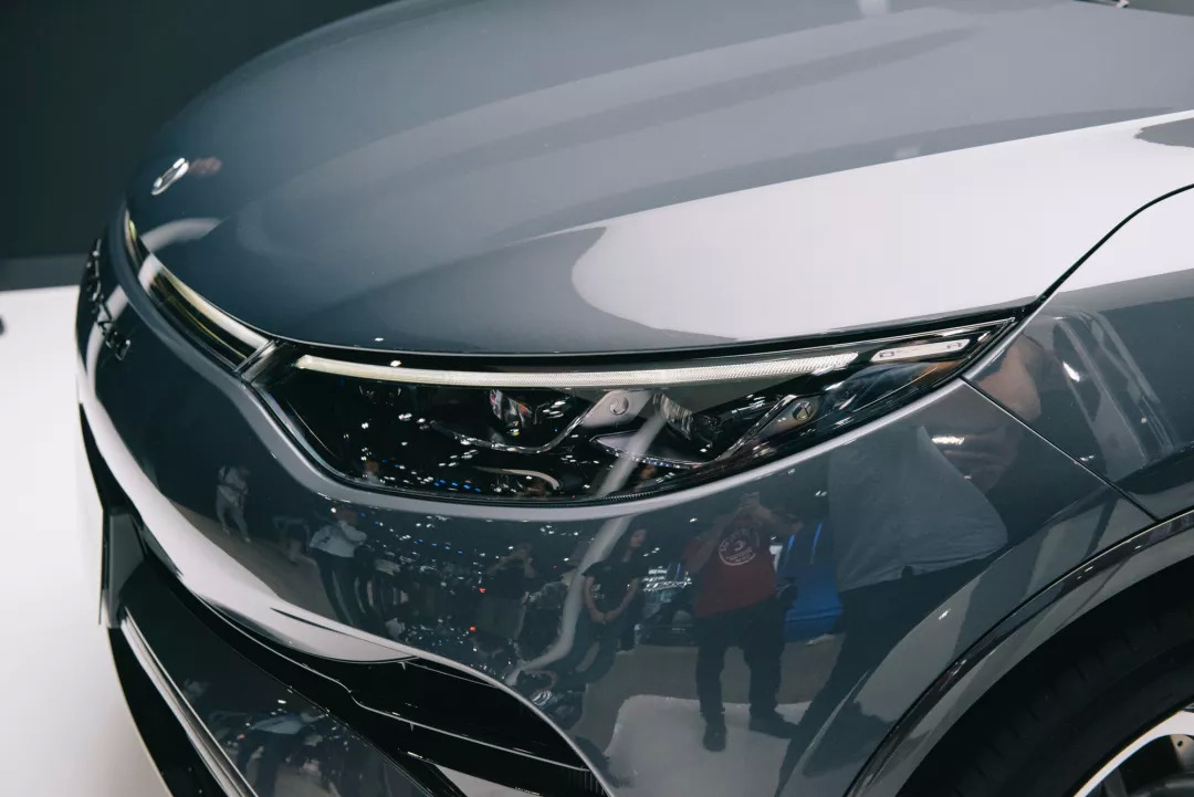 广汽新能源的Aion LX的外观充满了未来感,名为“天空之境”的设计语言讲求尽可能多的增加外观迎光面,使车身能够更好地反射出天空的倒影——天空倒影效果如何在展馆里无法得知,不过从聚光灯照射效果看Aion LX的视觉观感倒是真的显得很高级,多边形的轮毂罩更是让人印象深刻。