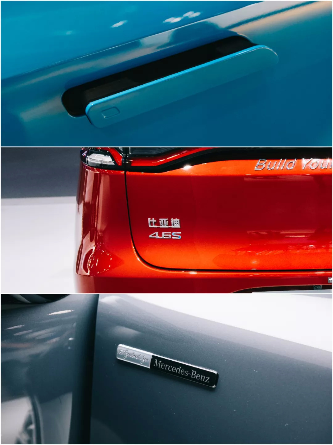 而这三部车都各自拥有比较有意思的外观细节:Aion LX是三款车中唯一使用伸缩式隐藏门把手的车型;比亚迪唐EV则高调地将0-100km/h加速时间贴在了车尾;而腾势X干脆在车身最显眼的各处贴上“Styled by Mercedes-Benz”的标签,以提醒买家腾势X的血统出身。