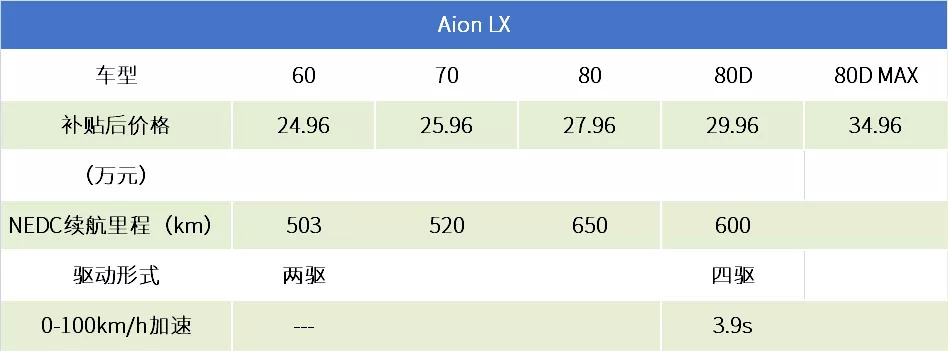 Aion LX共计推出了5款车型,车型名称数字越大续航能力越强,其中80D和80D MAX两款车型的动力最大扭矩达到了700Nm,0-100km/h加速3.9秒就能完成,加速性能为三车之最。