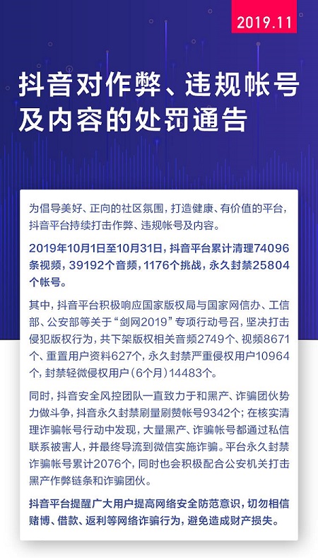 11月20日,抖音发布了最新一期《抖音对作弊、违规帐号及内容的处罚通告》,通告显示,2019年10月1日至10月31日期间,抖音平台累计清理74096条视频,39192个音频,1176个挑战,永久封禁25804个帐号。其中,在核实清理诈骗帐号专项行动中,抖音核实诈骗情况永久封禁诈骗账号累计2076个。
