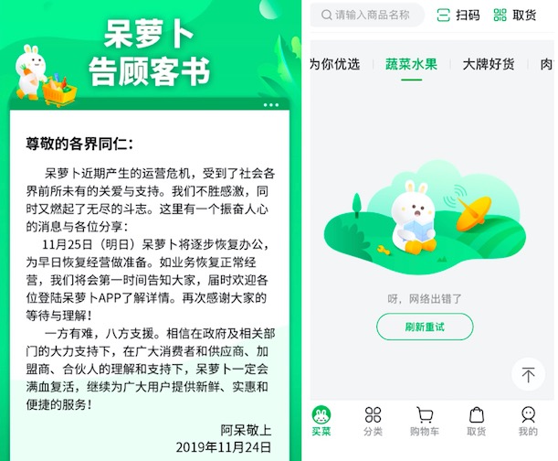 界面新闻注意到,呆萝卜在其APP和小程序上均贴出了“告顾客书”,称将逐步恢复办公,为恢复经营做准备。截至发稿,APP上商品均已下架。