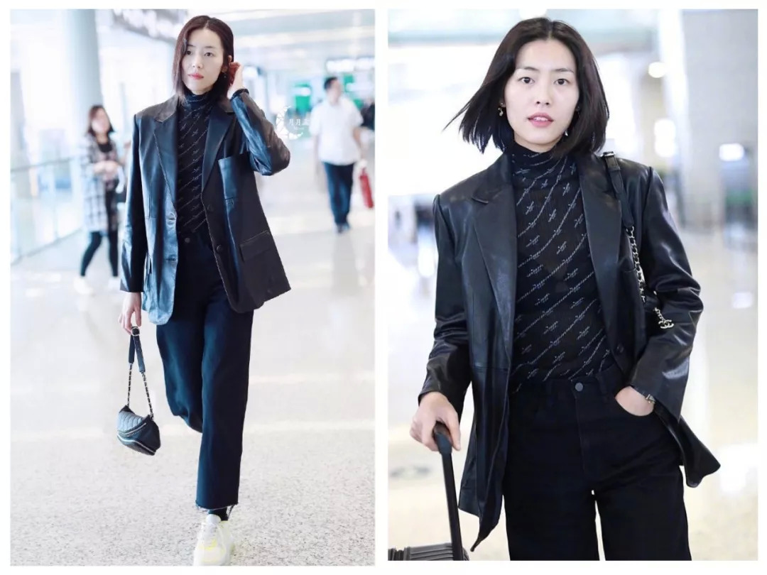 表姐刘雯前段时间穿过一件黑色皮西装,来自Dazzle。搭配阔腿裤,舒服又时髦!