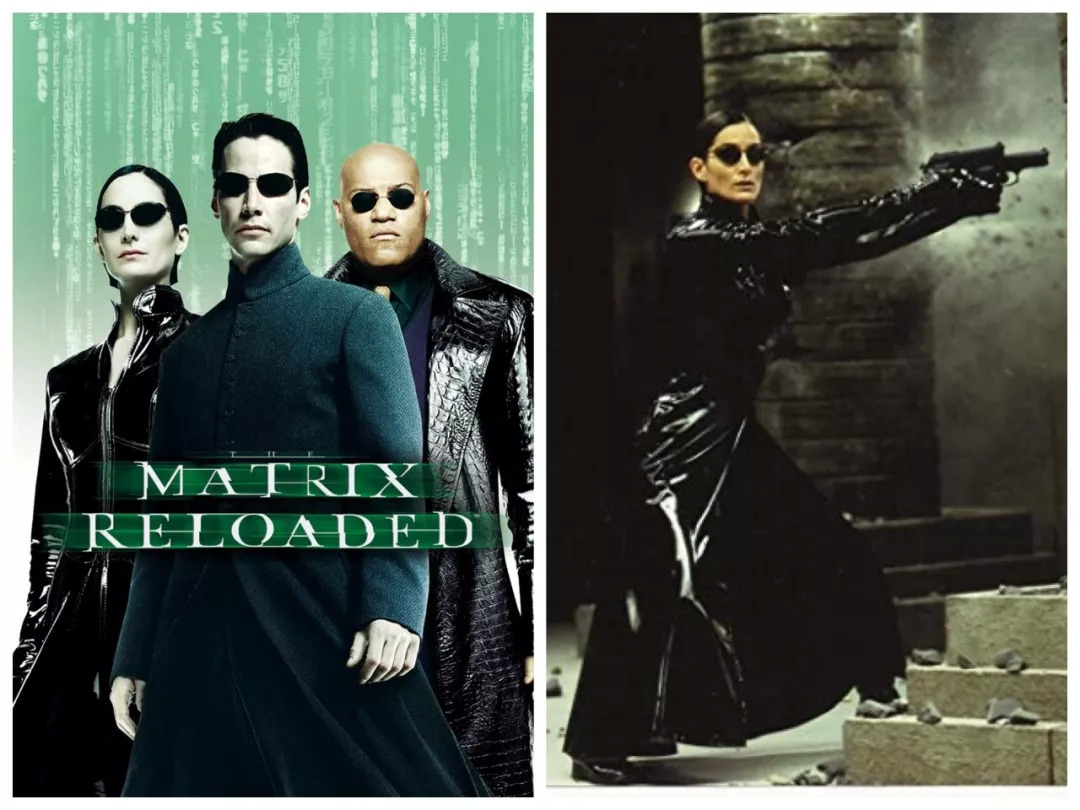 想当年,凯瑞·安·莫斯手举手枪,一身黑色皮裤、皮风衣、蛤蟆镜现身,真是“杀气腾腾”!完全不输身旁的男主演基努里维斯!